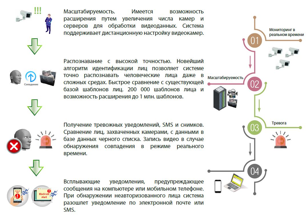 Обеспечение общественной безопасности Система, развернутая в людных местах, таких как железнодорожные вокзалы и станции, пешеходные зоны и автобусные остановки, сравнивает лица с базой людей, скрывающихся от правосудия. В случае обнаружения таковых обеспечивает оперативное уведомление государственных органов защиты правопорядка. |