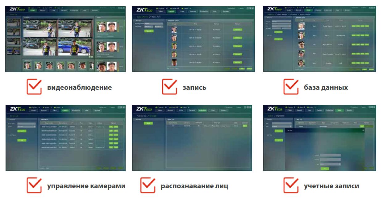 Программное обеспечение разделено на 7 модулей (видеонаблюдение, запись, база данных, управление камерами, распознавание лиц, учетные записи, система).