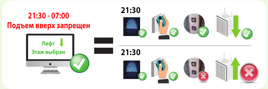 Программное обеспечение может ограничить работу лифтов в определенное время. Например, если в настройках указано, что с 21:00 до 7:00 лифт выключен, то в этот период времени посетители не смогут воспользоваться лифтом не зависимо от наличия RDID карт.