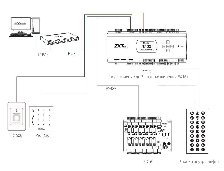 Управление лифтом ZKTeco может работать в автономном и онлайн режимах.