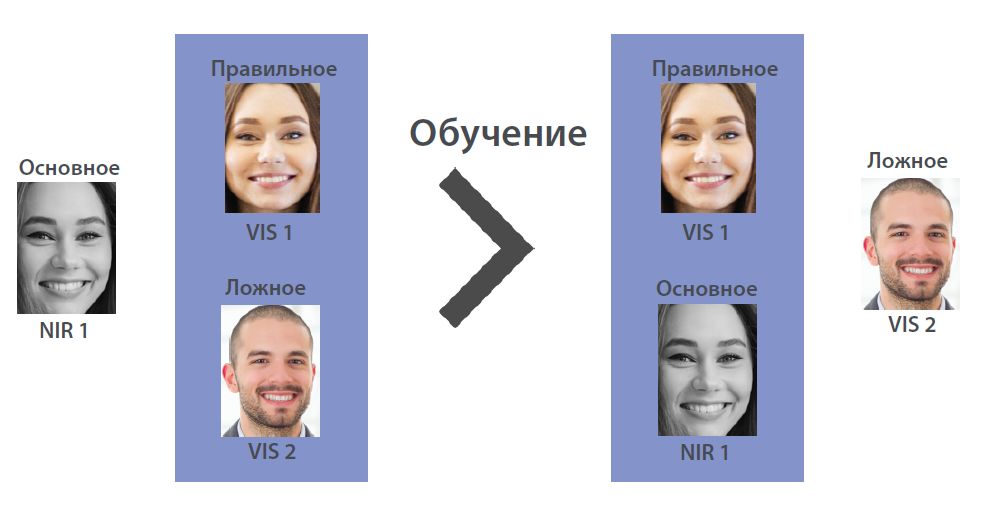 В настоящее время мы разрабатываем мульти-модульную технологию распознавания лиц на основе ближнего инфракрасного (NIR) и видимого спектра (VIS). Модуль самообучения выбирает изображение NIR в качестве основного, и два изображения VIS в качестве дополнительных: один правильный образец и один ложный образец. Выбор изображения NIR в качестве базового и использование триплета для обучения позволит еще больше сократить разницу между базовым и правильным образцом и легко отличить ложный образец.