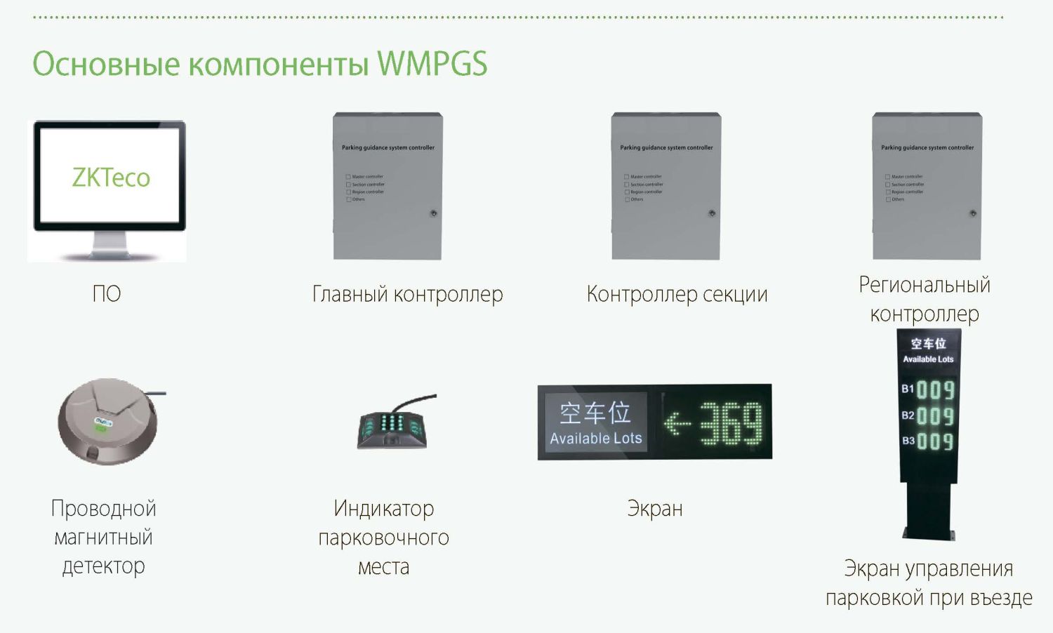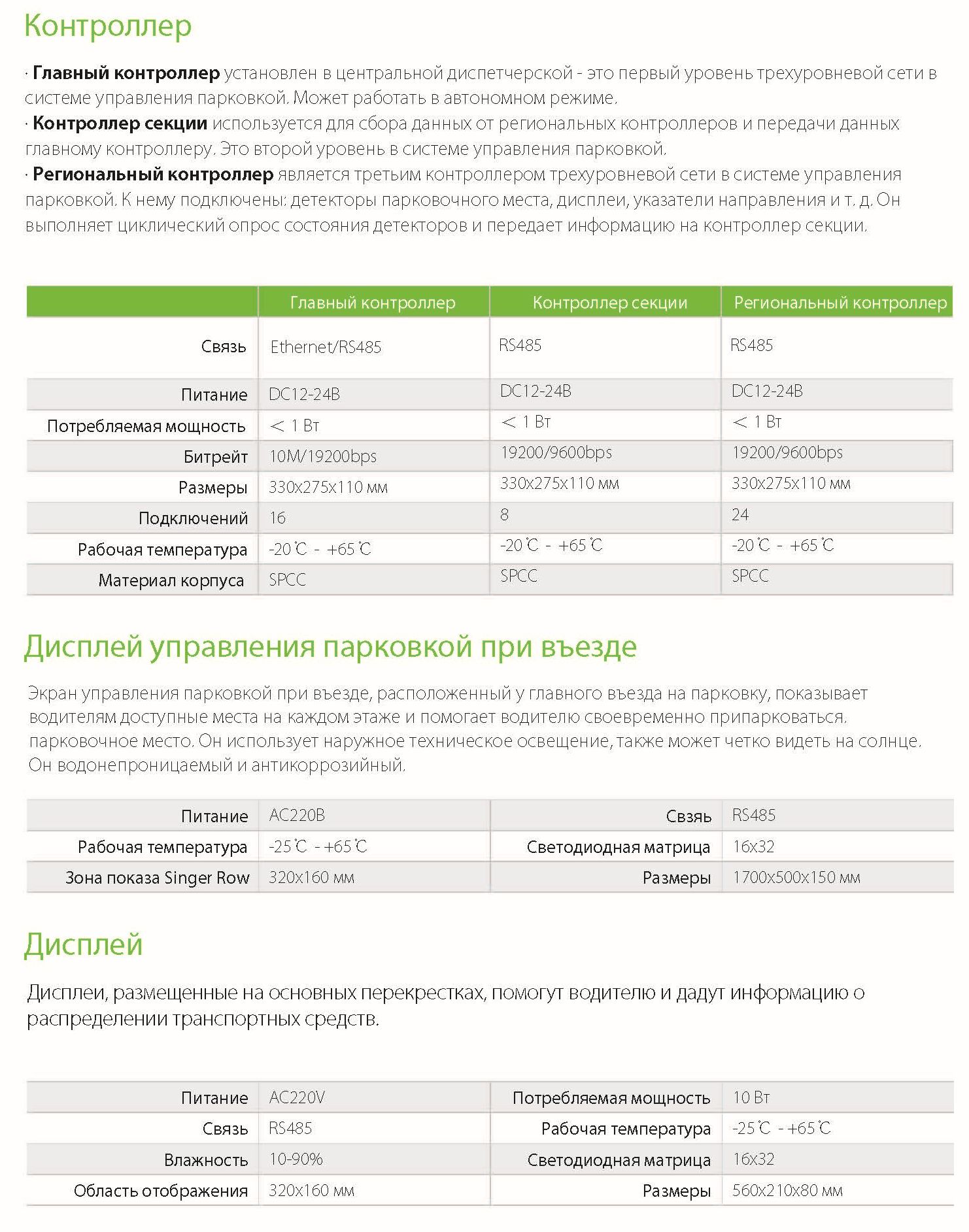 Ультразвуковая система управления парковкой состоит из ультразвуковых детекторов парковочных мест, индикатора парковочных мест, контроллера, экрана дисплея навигации и программного обеспечения для управления системой. Между устройствами используется связь RS485.