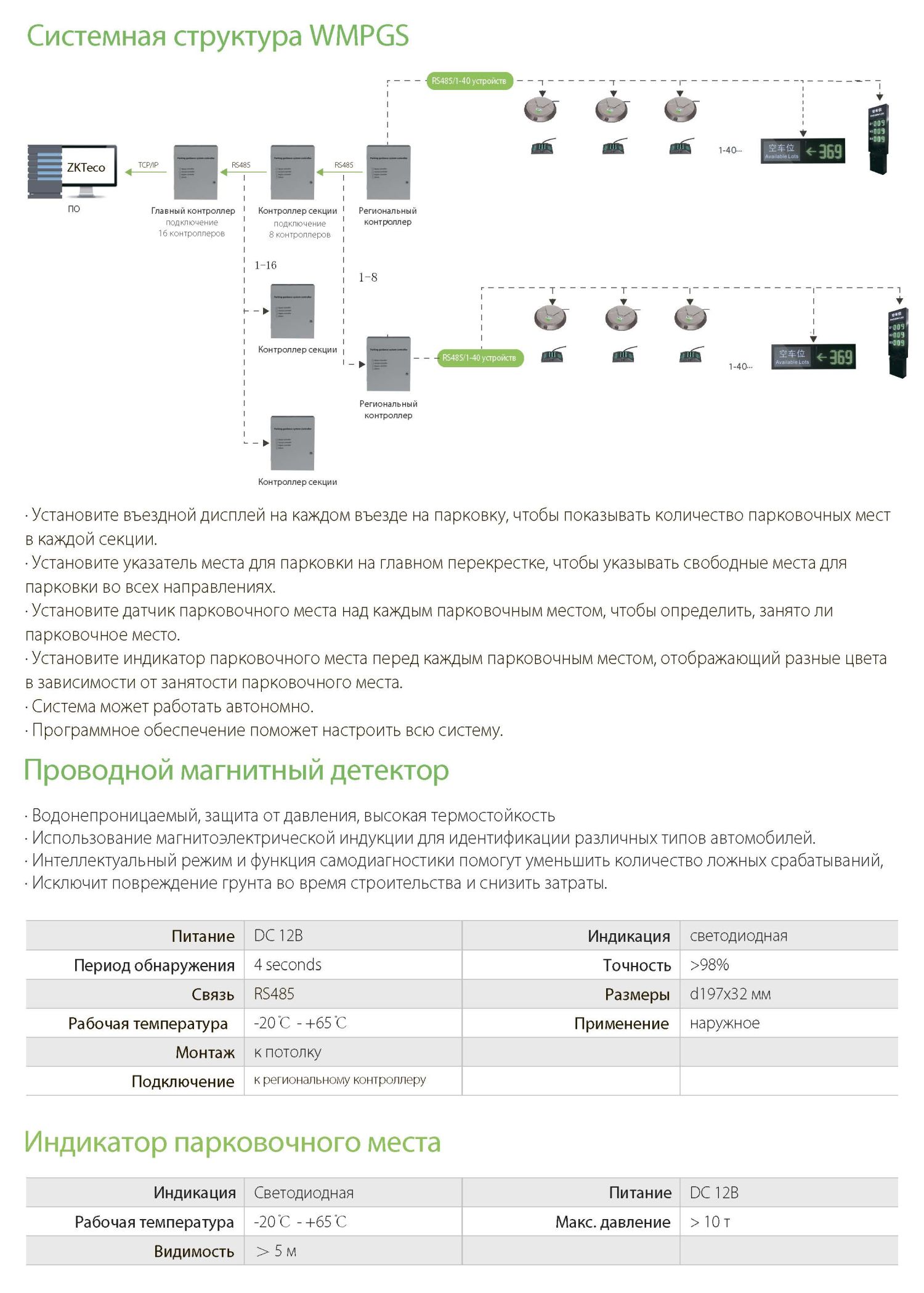 Проводная магнитная система управления парковкой состоит из магнитного детектора, индикатора парковочного места, контроллера, дисплея навигации и программного обеспечения для управления системой. Между устройствами используется связь RS485. Эта система может значительно улучшить коэффициент использования парковочного места, повысить уровень управления парковкой и в то же время облегчить водителю быстрый поиск парковочного места.