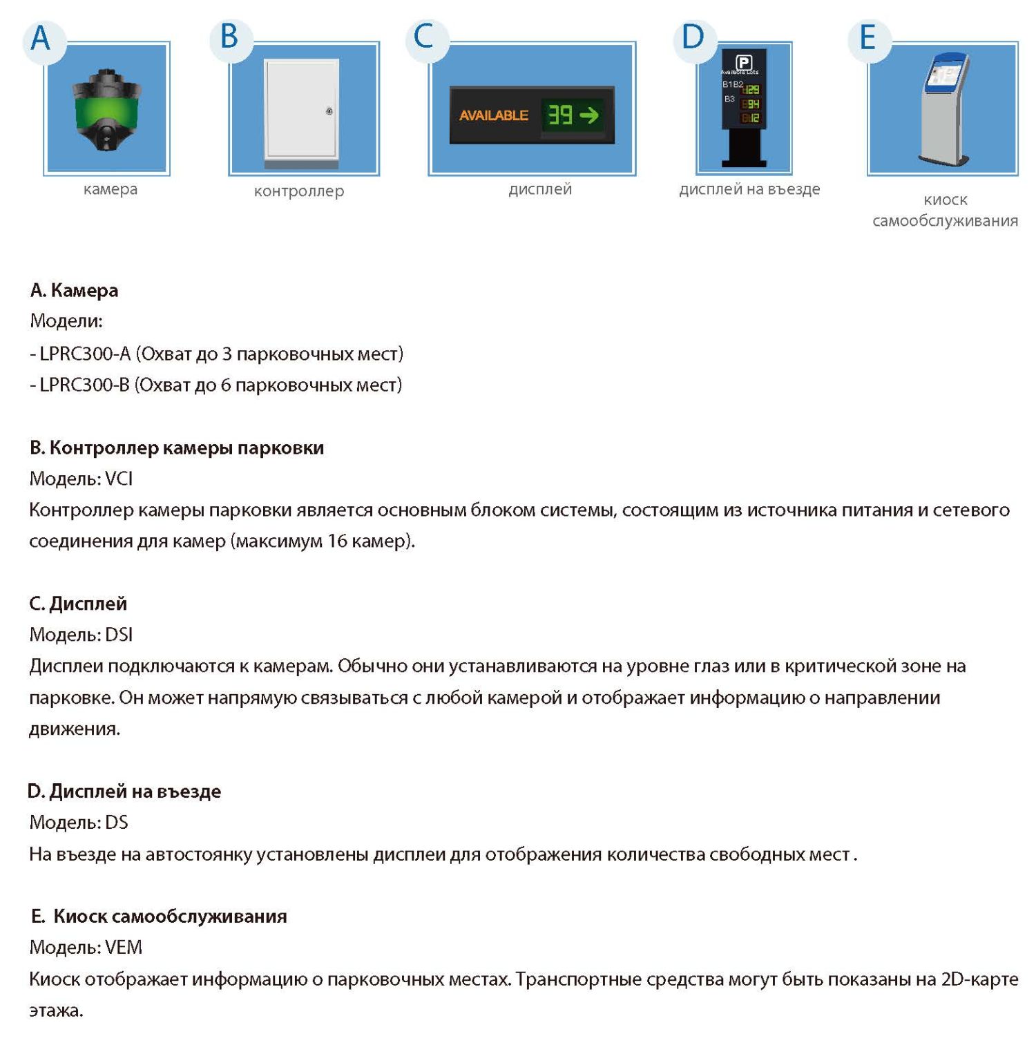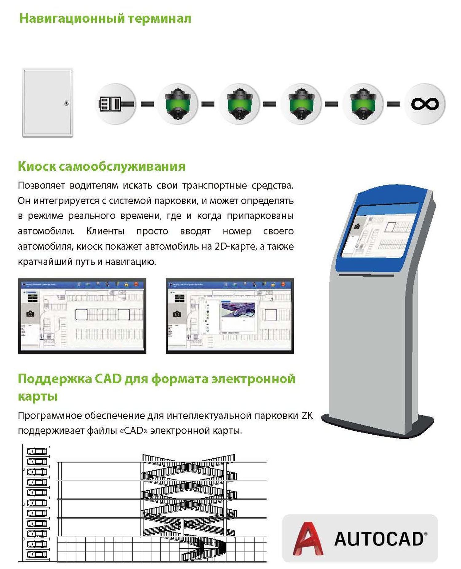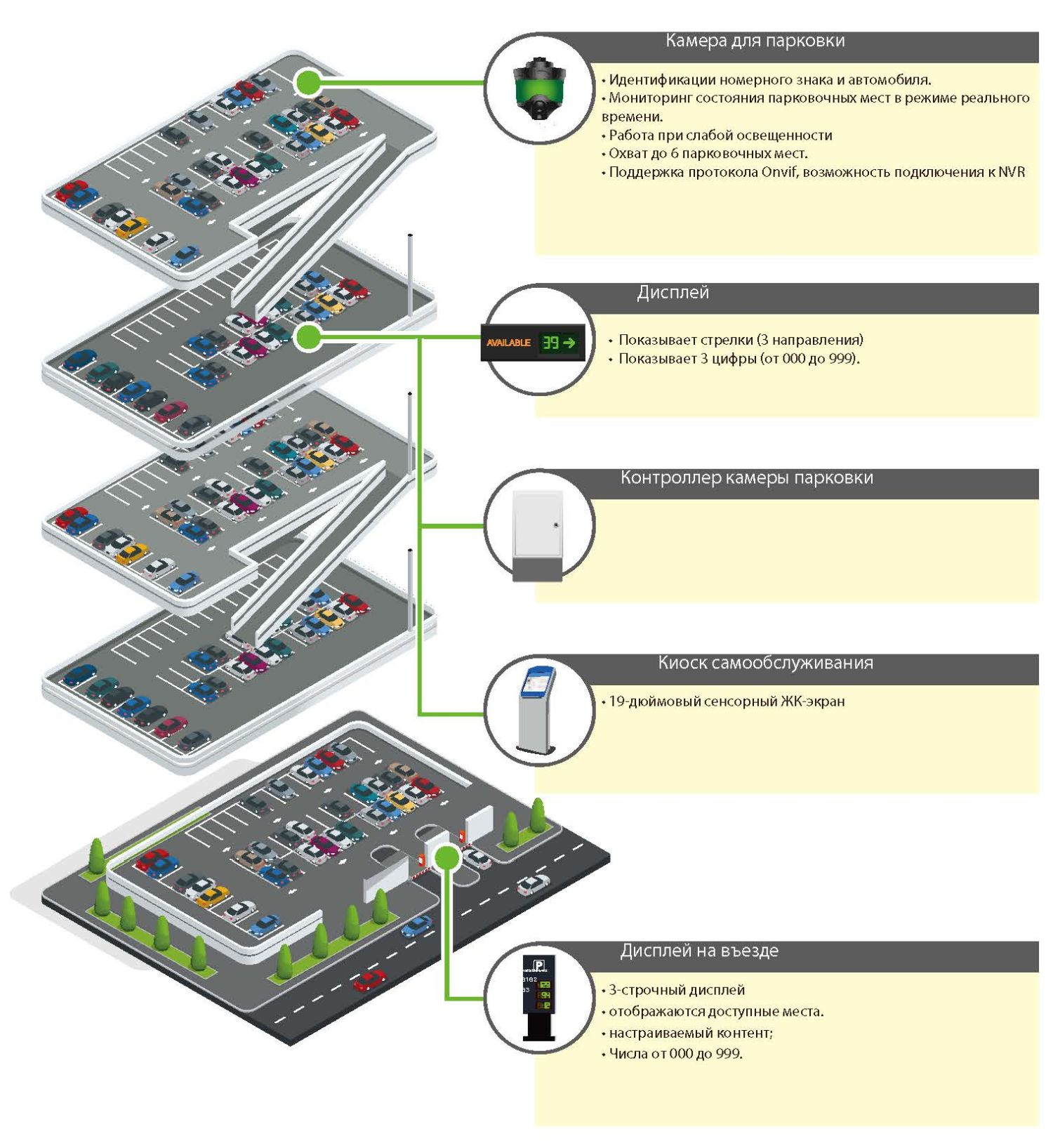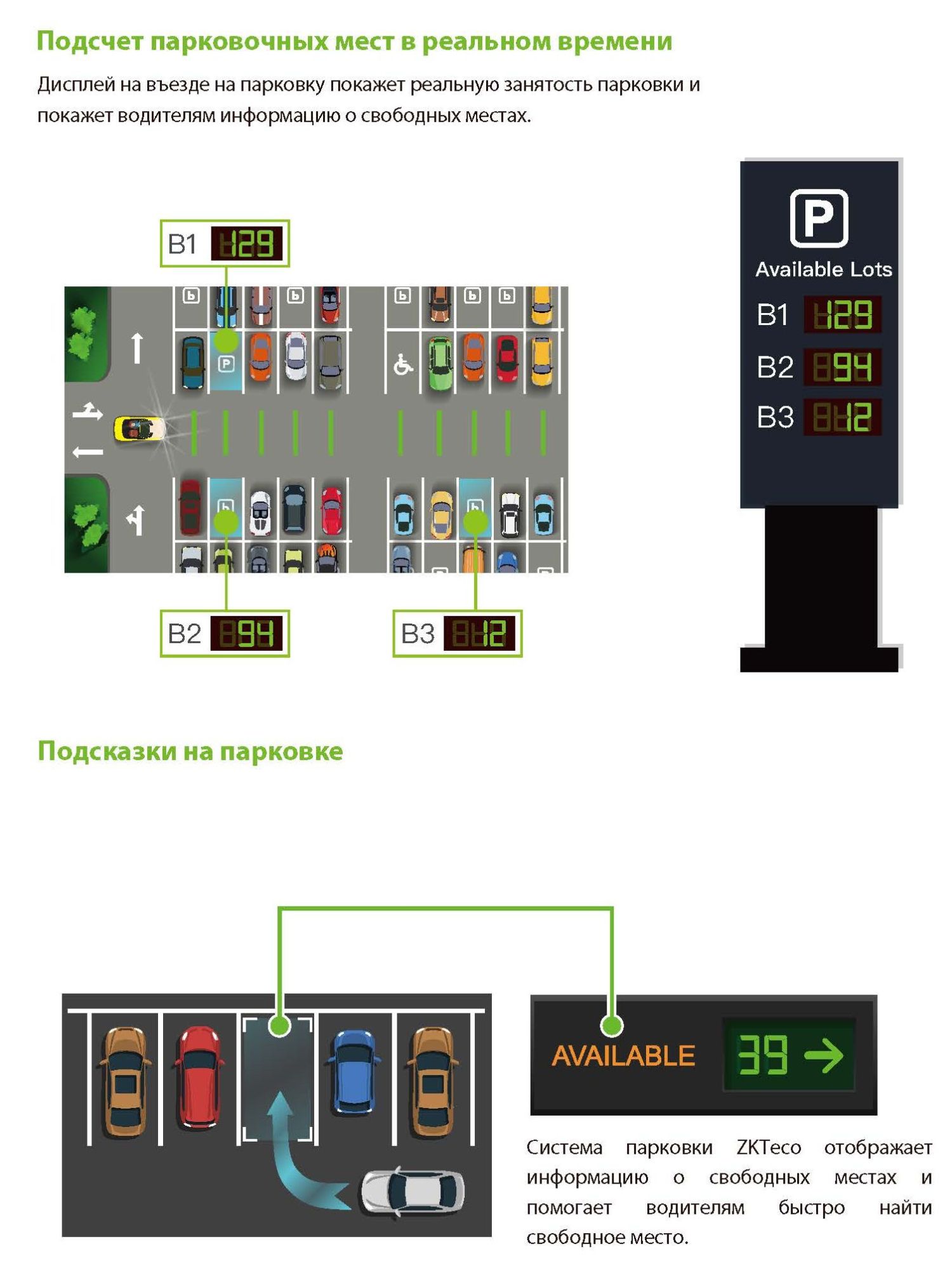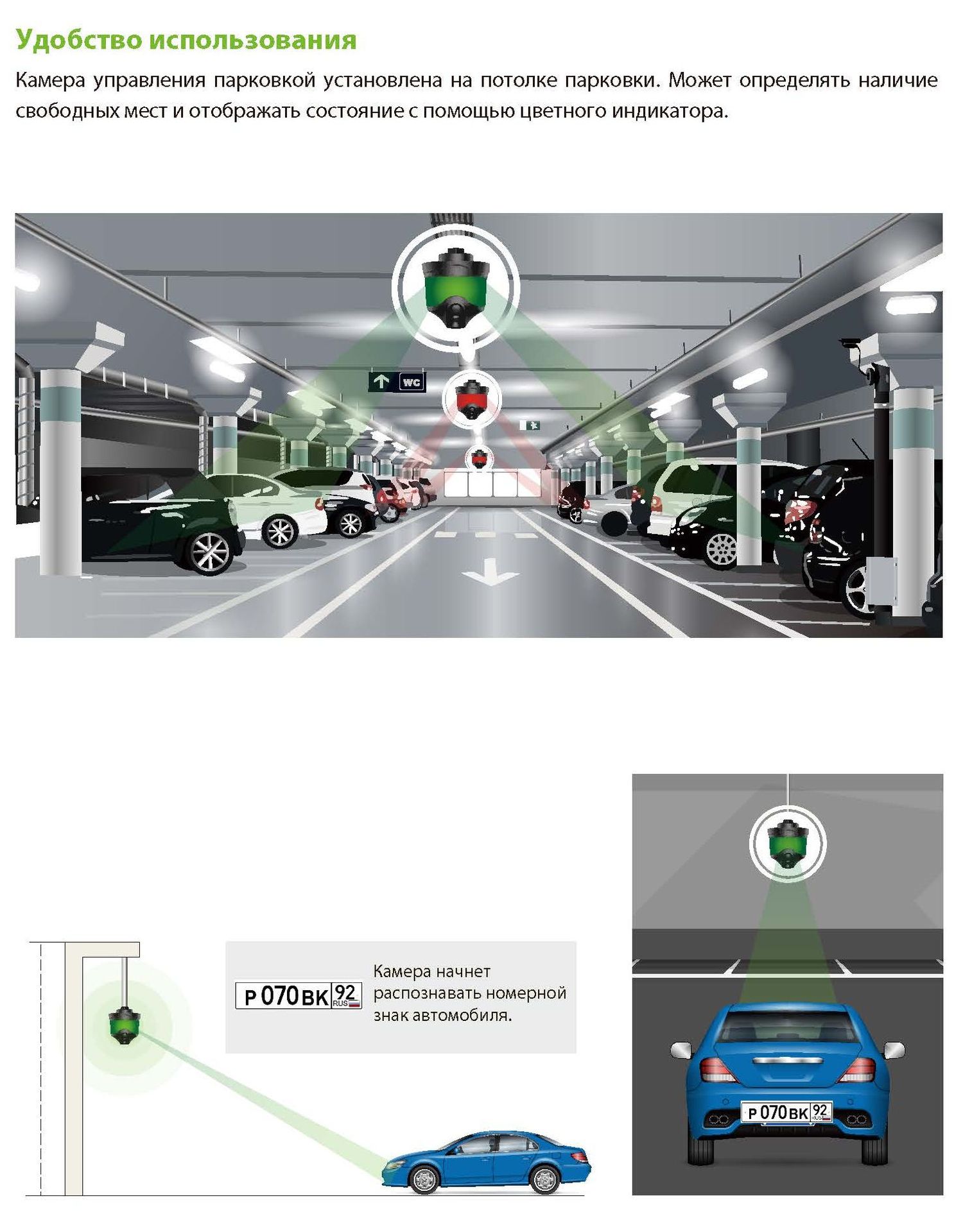 Система видеоуправления парковкой даст водителям точную информацию о парковке с помощью световых индикаторов и камер для парковки. С помощью киоска самообслуживания водители смогут легко найти свой автомобиль или найти свободное место.
